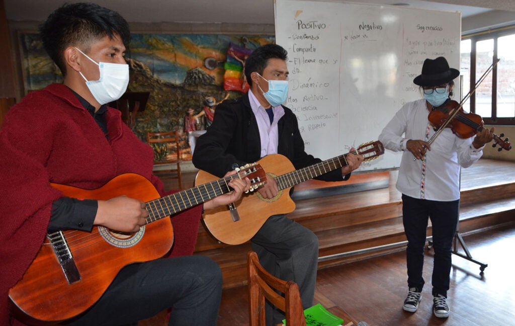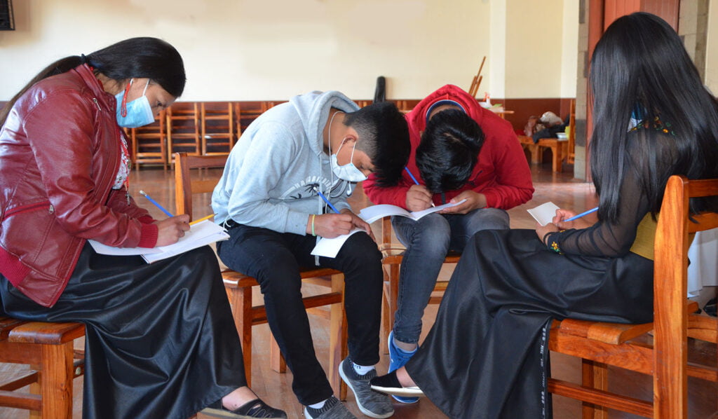 Jovenes kichwas cantando a la VIDa y a la Esperanza, durante el taller.