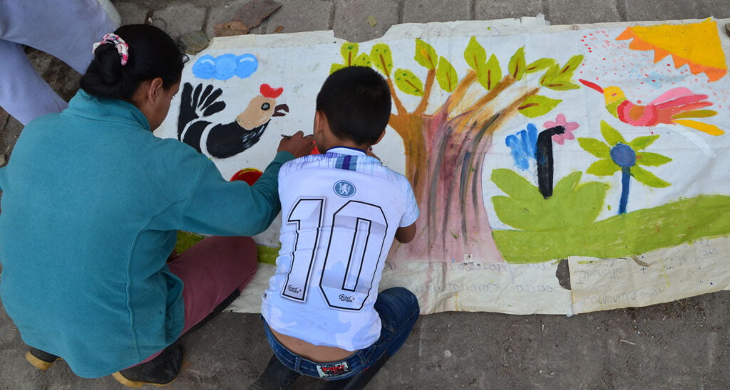 Madre e hijo pintando una tela para expresar su solidaridad con la Tierra y evitar la explotación minera.