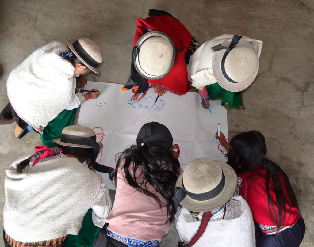 Jovenes kichwas y mestizos dialogando para encontrar una idea de denuncia de la violencia de genero.